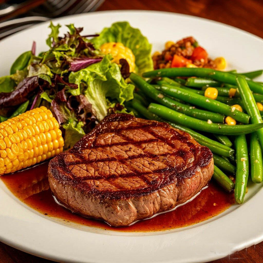 Стейк из говядины с овощами.